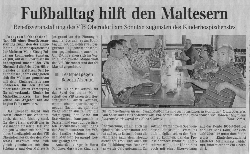 Benefizveranstaltung des VfB Oberndorf am Sonntag zugunsten des Kinderhospizdienstes lautet die Überschrift über dem Artikel in der GNZ vom 16.7. 2013 Seite 23