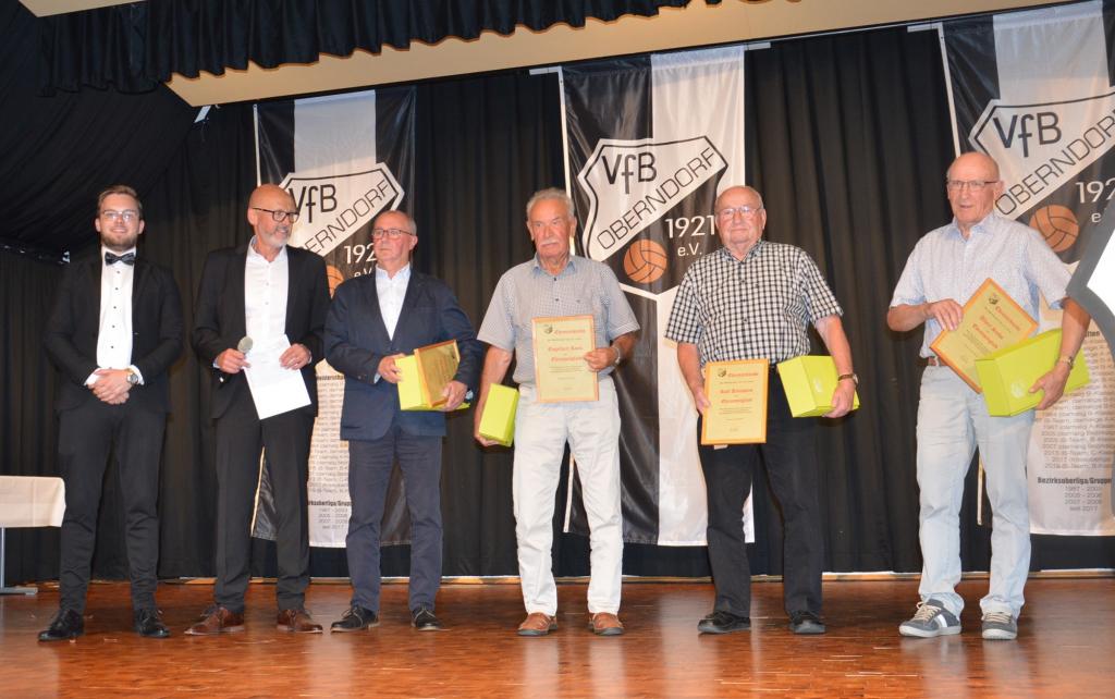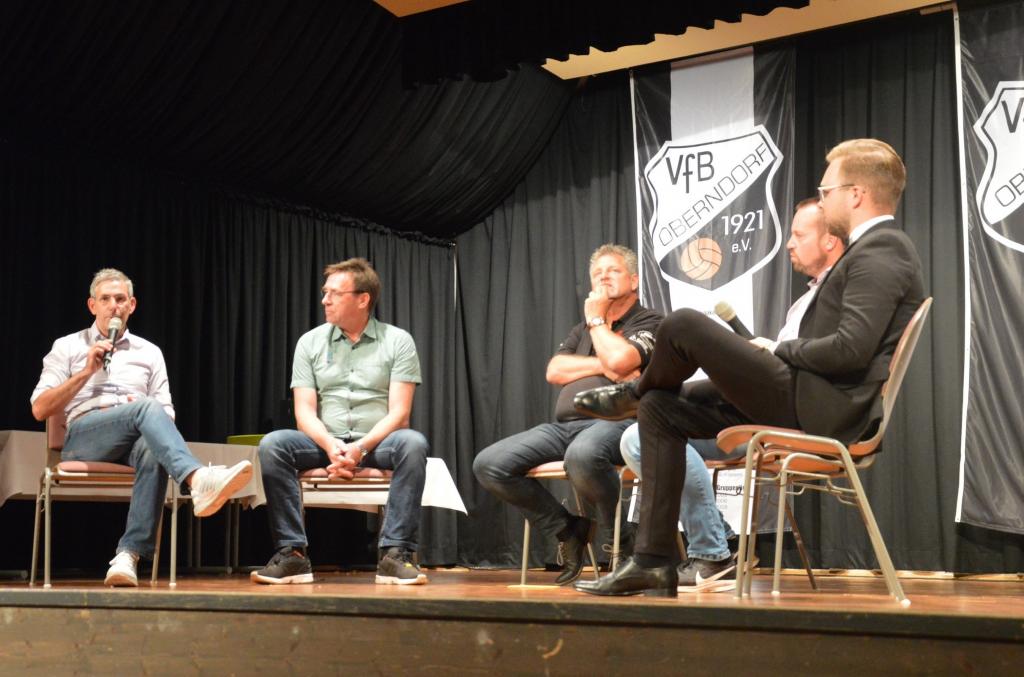 Gegen Ende des Abends kamen dann auch die befreundeten Fußballvereine sowie die Ortsvereine zu Wort – allerdings in etwas anderer Form: einer Talkrunde. So wurde Bilanz gezogen zu den Spielgemeinschaften der letzten Jahre, zu den entstandenen Freundschaften – auch über die Ortsgrenzen hinweg – und Erfahrungen ausgetauscht. Ein besonderes Highlight war sicherlich die Idee der Pure Energy/Inkognito dem VfB zu einem Heimspiel eine Cheerleader-Truppe zu stellen sowie der Vorschlag für situationsbezogene Einlaufmusik, gespielt vom Musikverein Oberndorf. Zu dieser Gelegenheit wurden dann auch zwei musikalische Klassiker direkt vor Ort angestimmt und der Saal sang kräftig mit.