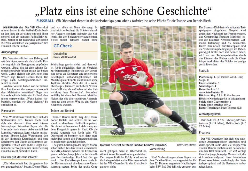 In der Ausgabe vom 28.1. 2014 berichtet das Gelnhäuser Tageblatt auf Seite 11 sehr ausführlich über unseren VfB. Reflektiert wird das Fußballjahr 2013. Darüber hinaus wird eine Vorschau auf die Rückrunde gegeben.