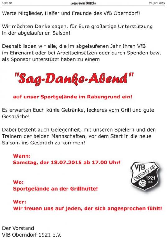 Am Samstag, der 18.07.2015 ab 17.00 Uhr laden wir alle Mitglieder, Freunde, Helfer, Unterstützer, Sponsoren, ... zu einem "Sag Danke Abend" auf unsere Sportgelände im Rabengrund ein. Das Vorstandsteam freut sich auf Euren Besuch. Es erwarten Euch kühle Getränke, leckeres vom Grill und gute Gespräche. Dabei besteht auch Gelegenheit mit unseren Spielern Trainern der beiden Mannschaften zu sprechen.