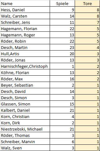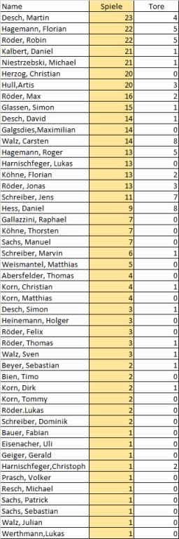 "Capitano" Martin Desch ging vorbildlich voraus. Er hat mit 23 Spielen die meisten Saisoneinsätze. Florian Hagemann und Robin Röder folgen mit 22 Einsätzen. Torschützenkönig wurden die "Oldies" Daniel Hess vor Carsten Walz. Beide schossen 8 Tore. Daniel benötigte dafür 9 und Carsten 14 Spiele. Weitere Details siehe in den Grafiken in der Bildergalerie (zum Lesen bitte anklicken).