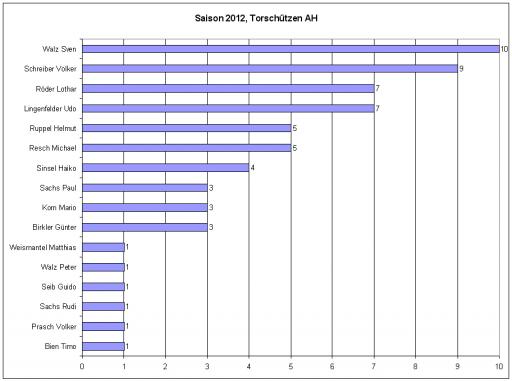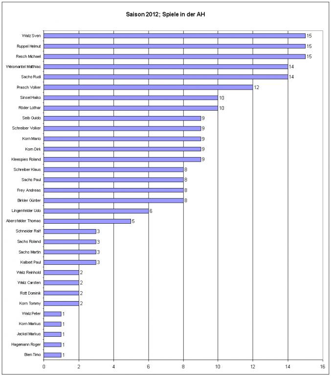Alle 15 Spiele absolvierten Michael Resch, Sven Walz und Helmut Ruppel. Erfolgreichster Torschütze war Sven Walz mit 10 Toren gefolgt von Volker Schreiber mit 9. Weitere Details siehe Grafiken. Insgesamt haben wir 32 Spieler eingesetzt. Dabei gilt unser besonderer Dank den – zum Teil kurzfristig engagierten – „Aushilfsspieler“. Mit Euch konnten wir zumindest die Zahl von 15 ausgetragenen Spielen erreichen :-)