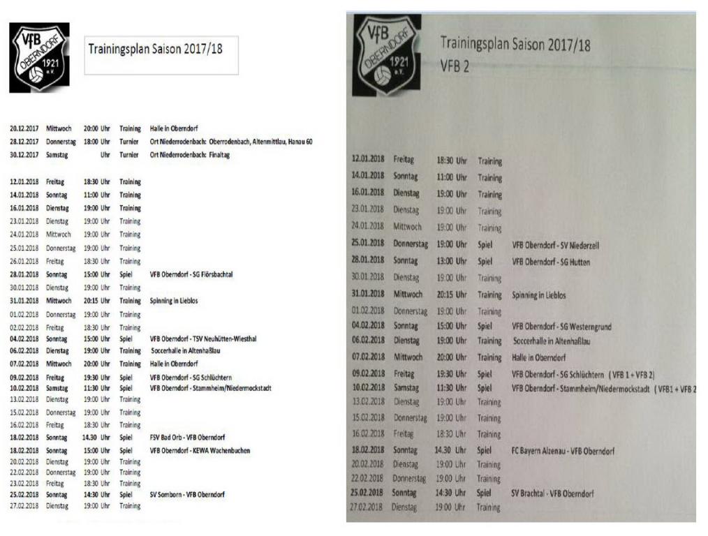 Donnerstag, 25.01. um 19:00 ( Training VfB 1 und erstes Testspiel VfB 2 gegen SV Niederzell in Oberndorf )