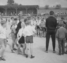 Der VfB war schon in den 60er Jahren sehr innovativ. Auf dem Sportplatz in der Sandkaute (heutiger Standort Jossatal-Schule in Oberndorf) war schon eine überdachte "Haupttribüne" gebaut. Leider sind dem Verfasser die Namen des Fotografen. des Lehrers und der abgebildeten SchülerInnen nicht bekannt.