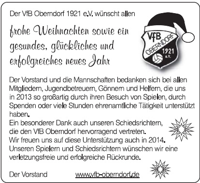 Frohe Weihnachten wünscht der VfB seinen Freunden im Jossgründer Blättche vom 21. Dezember 2013 auf Seite 9
